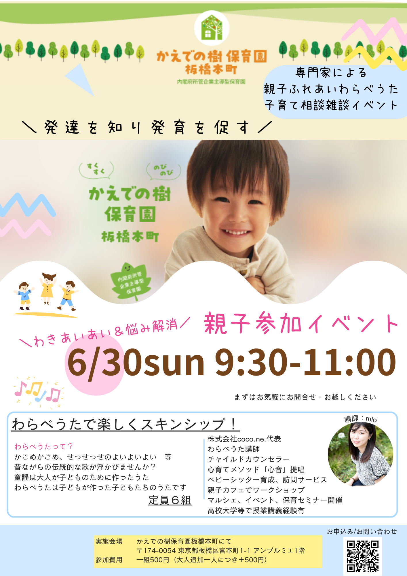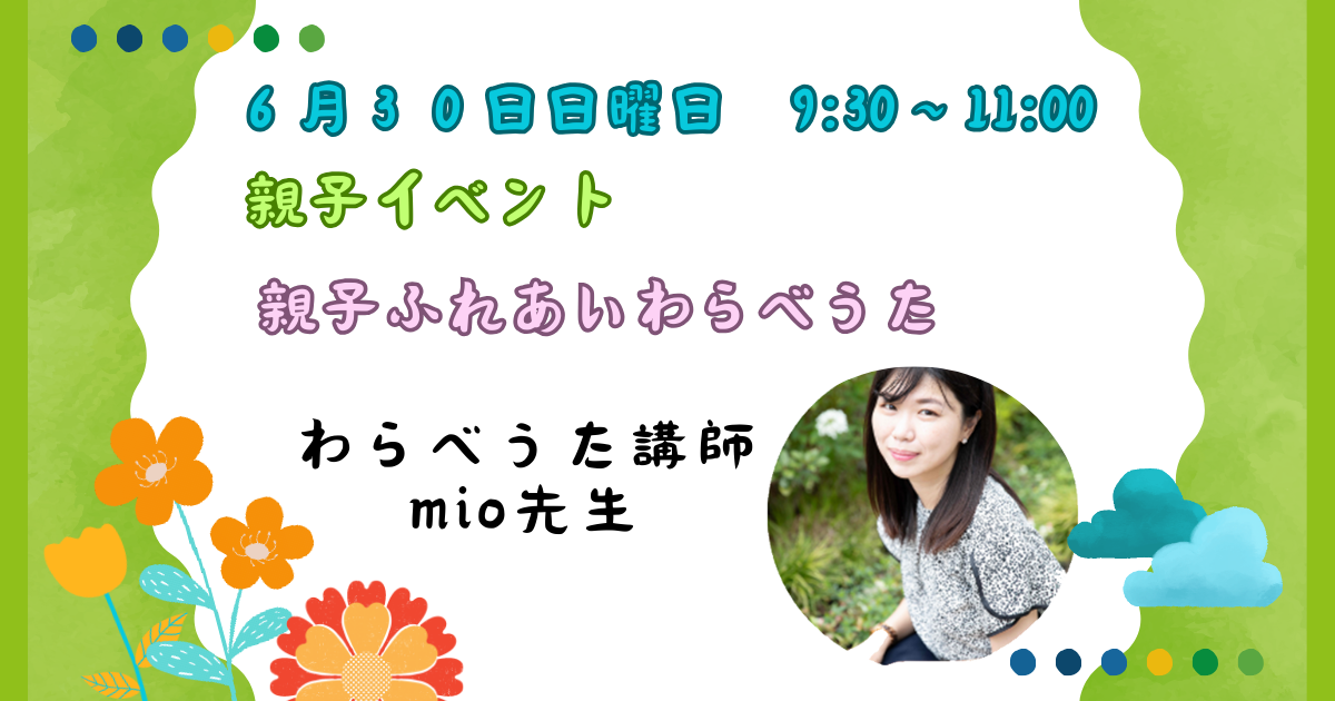 6月30日日曜日に、わらべうた講師のmio先生にお越しいただきます。